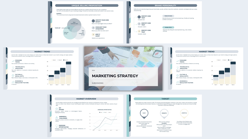 This editable Canva template features a clean, thoughtful layout to help you build your marketing strategy step-by-step. With 30+ professionally designed slides, built-in guidance and customizable charts, you’ll save hours while creating a strategy that inspires action and drives results.
